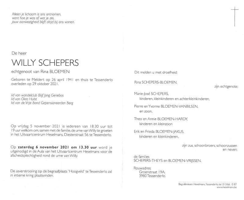 Wij melden het overlijden van Willy Schepers, echtgenoot van Rina Bloemen. Langs deze weg wensen we de ganse familie veel sterkte toe in deze zware periode.